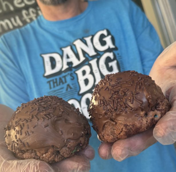 Chocolate cookie with chocolate chips, chocolate cake, chocolate sprinkles, and chocolate animal crackers. Stuffed with a house chocolate buttercream, then dipped in chocolate and finished with more sprinkles.