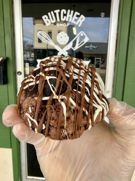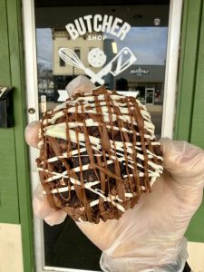Chocolate cookie with mini marshmallows, marshmallow fudge cookies, dark chocolate chips, fudge cake, and stuffed with a chocolate marshmallow frosting. Drizzled with white and milk chocolate